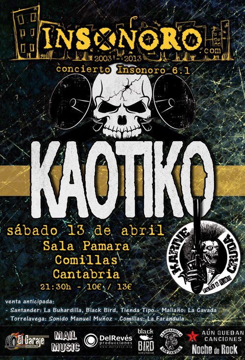Ya llega nuestro Concierto Insonoro 6.2, el sábado 13 de abril en la Sala Pamara de Comillas. La apertura de puertas será a las 21:30 horas, 22:00 h tocará Karne Cruda y a las 23:30 h. Kaótiko. Las entradas estarán en sus correspondientes puntos de venta hasta el viernes por la tarde que procederemos a retirarlas. Más info en el siguiente cartel:Vía: Insonoro